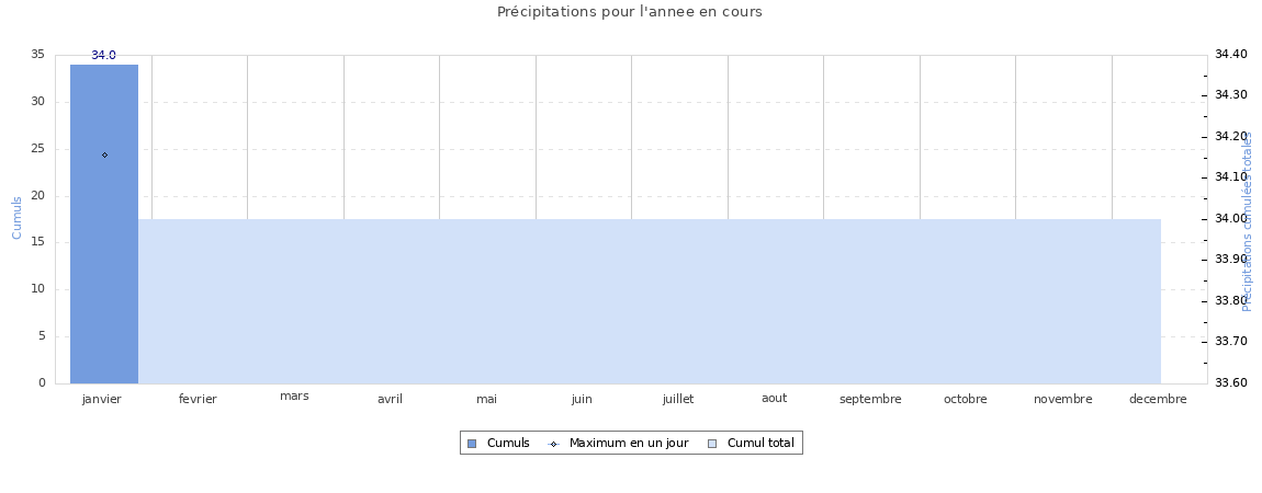 - Pluviomètrie mensuelle la plus élevée : 34.0 mm