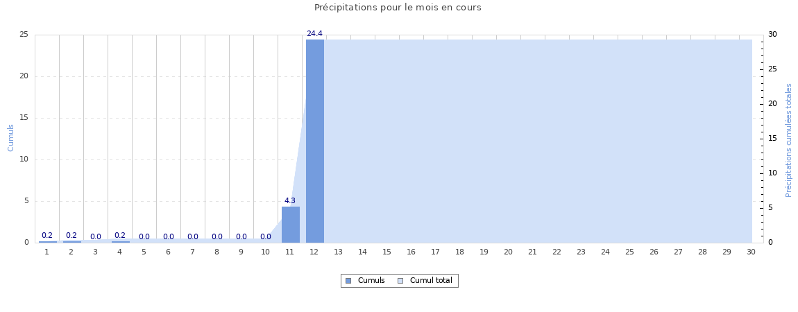 - Pluviomètrie maximale en une journée : 24.4 mm le 12