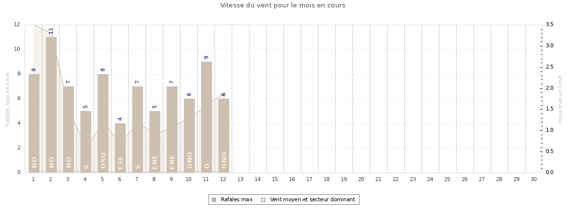- Rafales la plus élevée : 11.0 km/h le 2 à 16:09